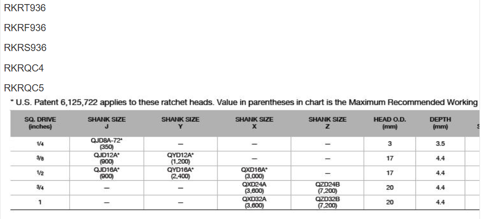 * U.S. Patent 6,125,722 applies to these ratchet heads. Value in parentheses in chart is the Maximum Recommended Working Torque, in.lb.