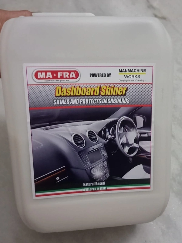 "Dashboard Shiner it is a mixture of natural wax and polymers, which is fast and easy to use. Generating a “silk” effect on interiors, plastic, and leather, It creates an effective protective barrier against the UVA rays and anti-depositing on exterior plastics. It does not smear or whiten plastic parts, pleasantly perfumed. Suitable for treating leather and for use o interior and exterior plastics. USAGE DILUTION RATIO - PURE AVAILABLE FORMAT -: 5KG-10KG"