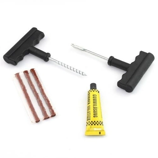 - 🏍 FULL RANGE OF ACCESSORIES: The offered kit contains T-Handle Split Eye Insert Tool, T-Handle Spiral Rasp Tool, Rubber Glue, Cutter, 10 Puncture Repair Strips, Pliers, Body Polish, 4 Tyre Valve Caps & Storage Bag.